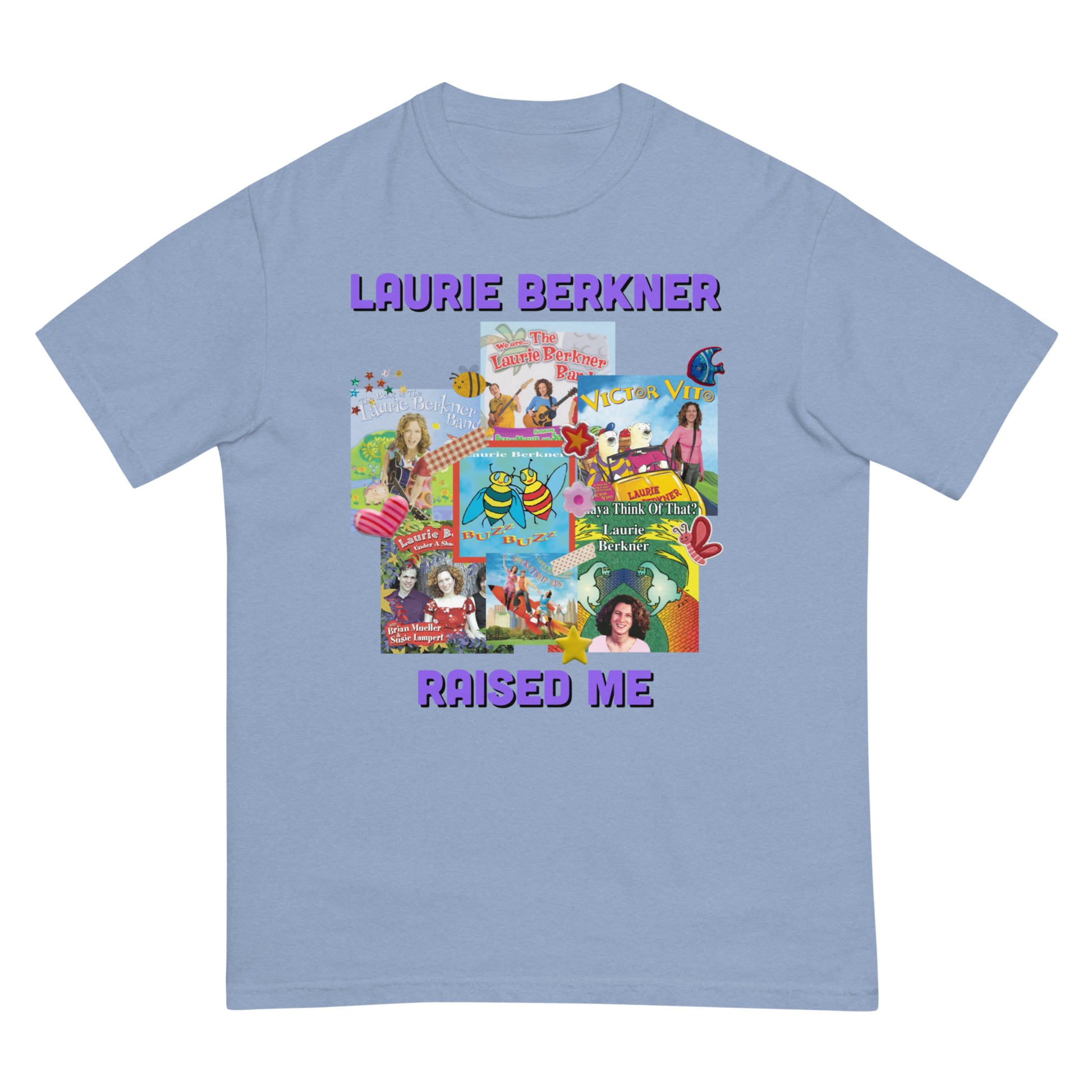 Laurie Berkner Raised Me design printed on the front of a tee.